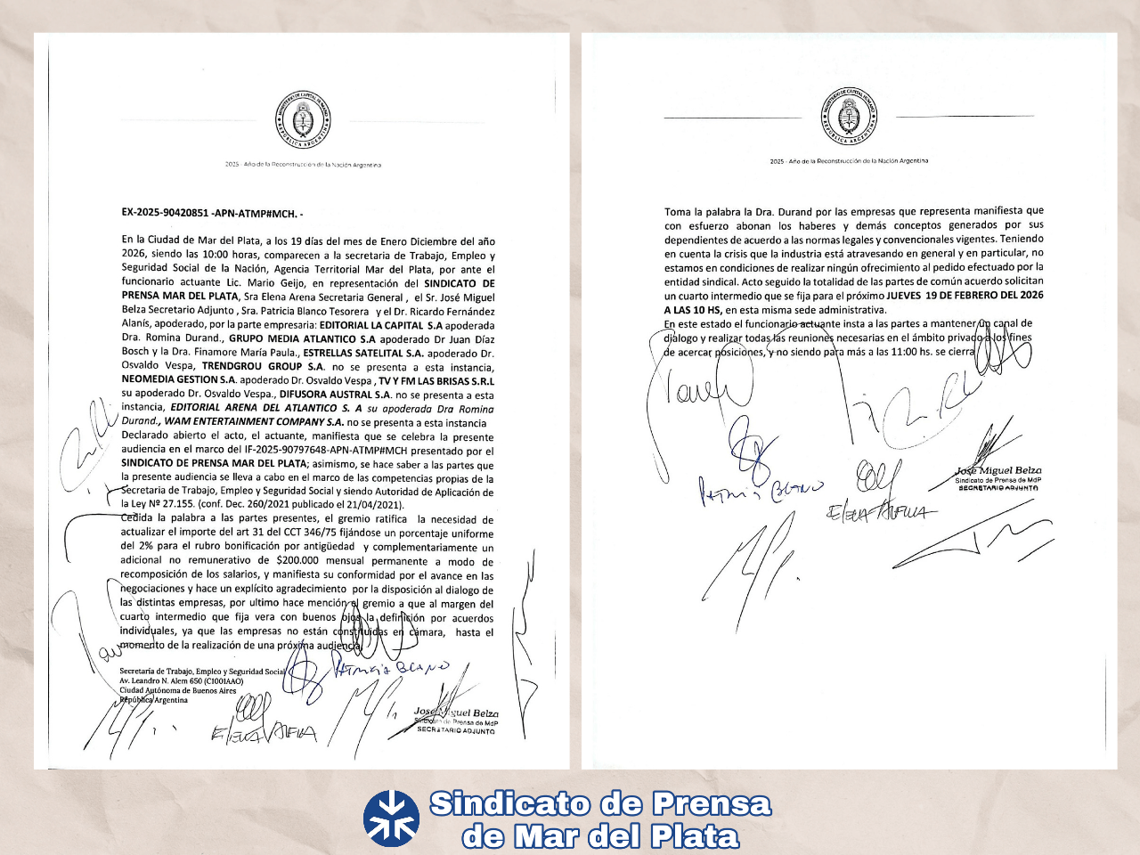 Ante el pedido realizado por parte del Sindicato de Prensa de Mar del Plata a las empresas locales de una actualización del 2% por año de antigüedad para el Art. 31° del CCT 346/75 y el pedido de un Adicional No Remunerativo de $ 200.000, se continúan las conversaciones entre partes incluso con La Capital a pesar de ser la única empresa que dejó por escrito su imposibilidad económica de hacer ofrecimiento alguno.